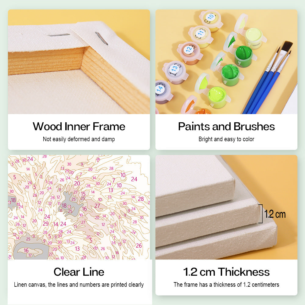 Scopri tutti gli elementi essenziali ben confezionati nel nostro kit Paint by Numbers. Con ogni componente etichettato e pronto per l'uso, puoi concentrarti esclusivamente sul tuo percorso artistico. Dai colori vivaci ai pennelli di precisione, ci siamo assicurati che nulla si frapponga tra te e la tua tela. Adatto sia ai principianti che agli artisti esperti, questo kit offre un'esperienza pittorica pura e ininterrotta.