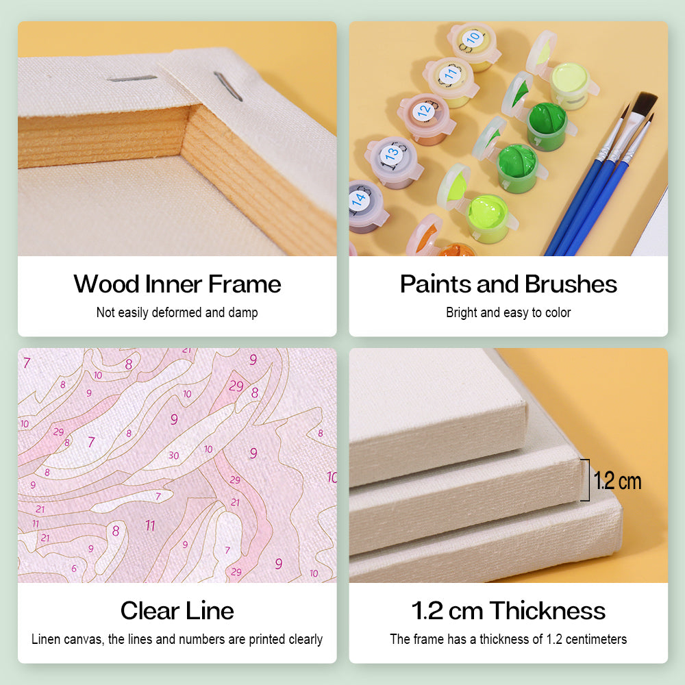 Scopri tutti gli elementi essenziali ben confezionati nel nostro kit Paint by Numbers. Con ogni componente etichettato e pronto per l'uso, puoi concentrarti esclusivamente sul tuo percorso artistico. Dai colori vivaci ai pennelli di precisione, ci siamo assicurati che nulla si frapponga tra te e la tua tela. Adatto sia ai principianti che agli artisti esperti, questo kit offre un'esperienza pittorica pura e ininterrotta.